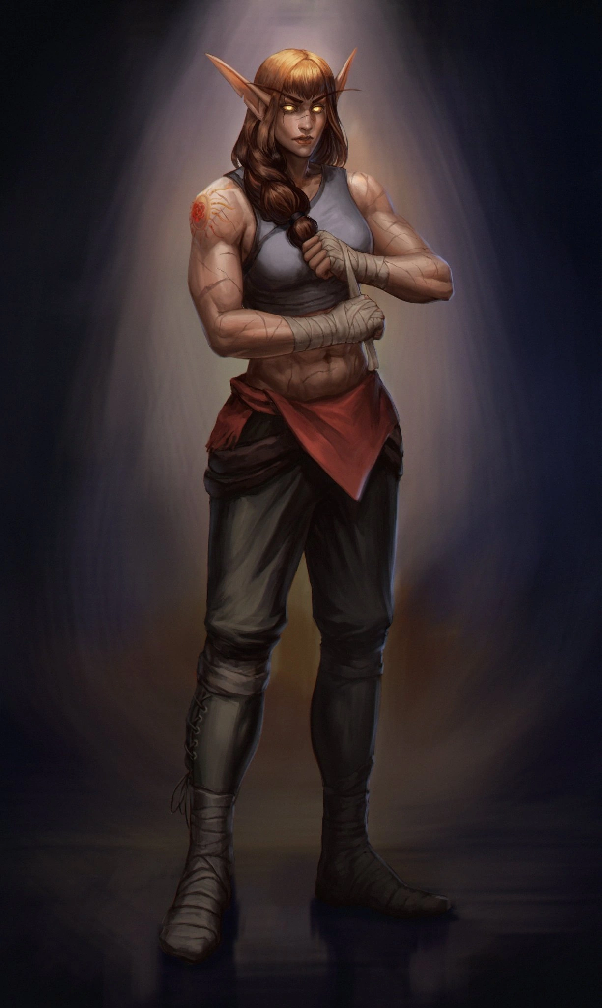 Skin that glistened with sweat in the sun was criss-crossed with scars from fights, duels and a bloody lifestyle. Her arms bearing the brunt of the scars were now thick, well defined with muscle developed fiercely over time. Her breasts were firm but bound tightly by her sleeveless shirt. She radiated strength, and her abs reflected her discipline to physical activity. A symmetrical back, draped with decades-old scars and telling its own story of her past, leads the eye downward to a full rear. While often hidden by her battle armour, it gives ample clues to her lower body power. While scars were fewer in her lower body, her legs had definitely seen their share of heavy lifting and forced marches. One would be blessed to see her without clothes or armour, her scars and physique combined to form a magical treat for the eyes and a warning to her enemies.